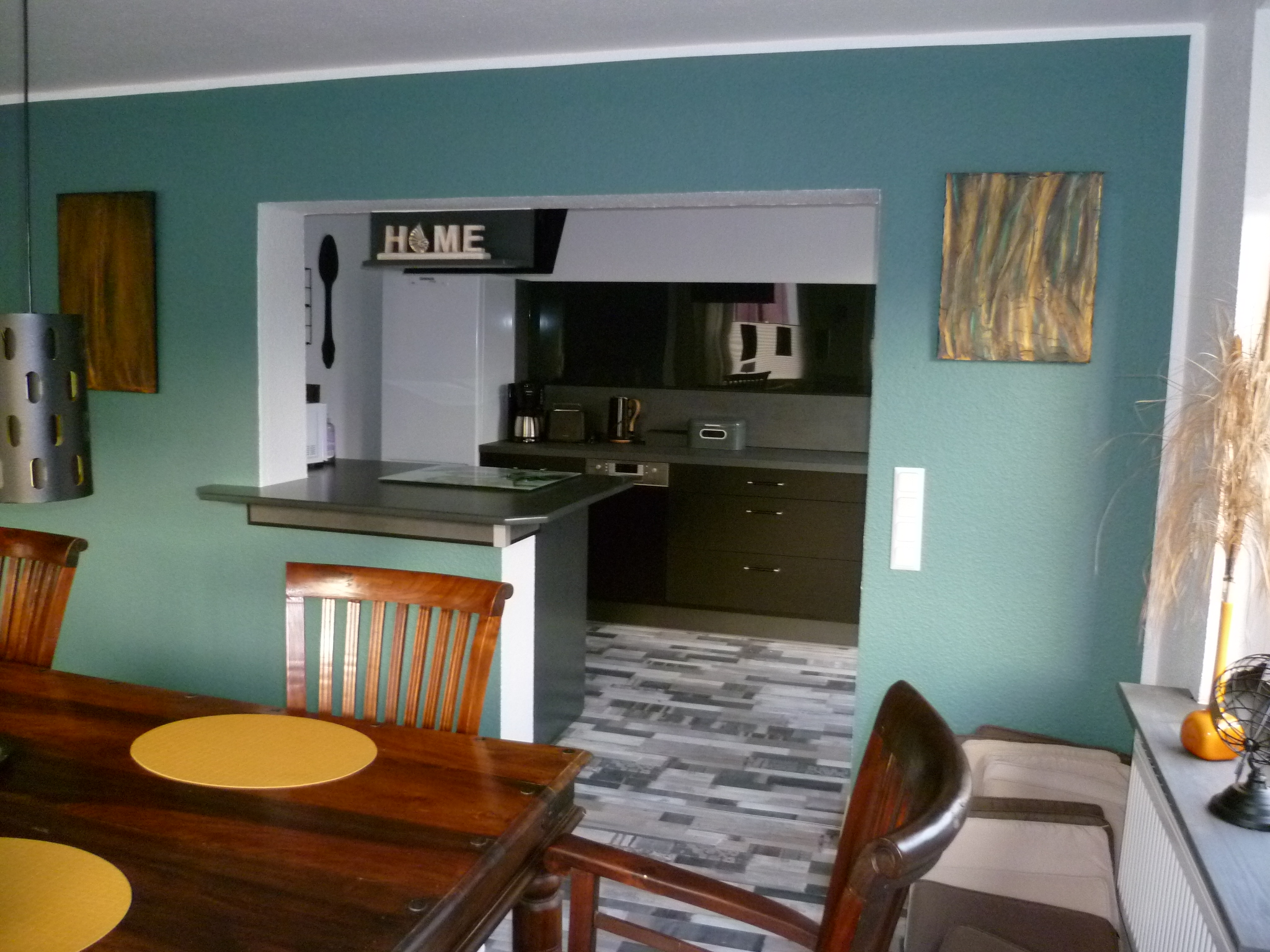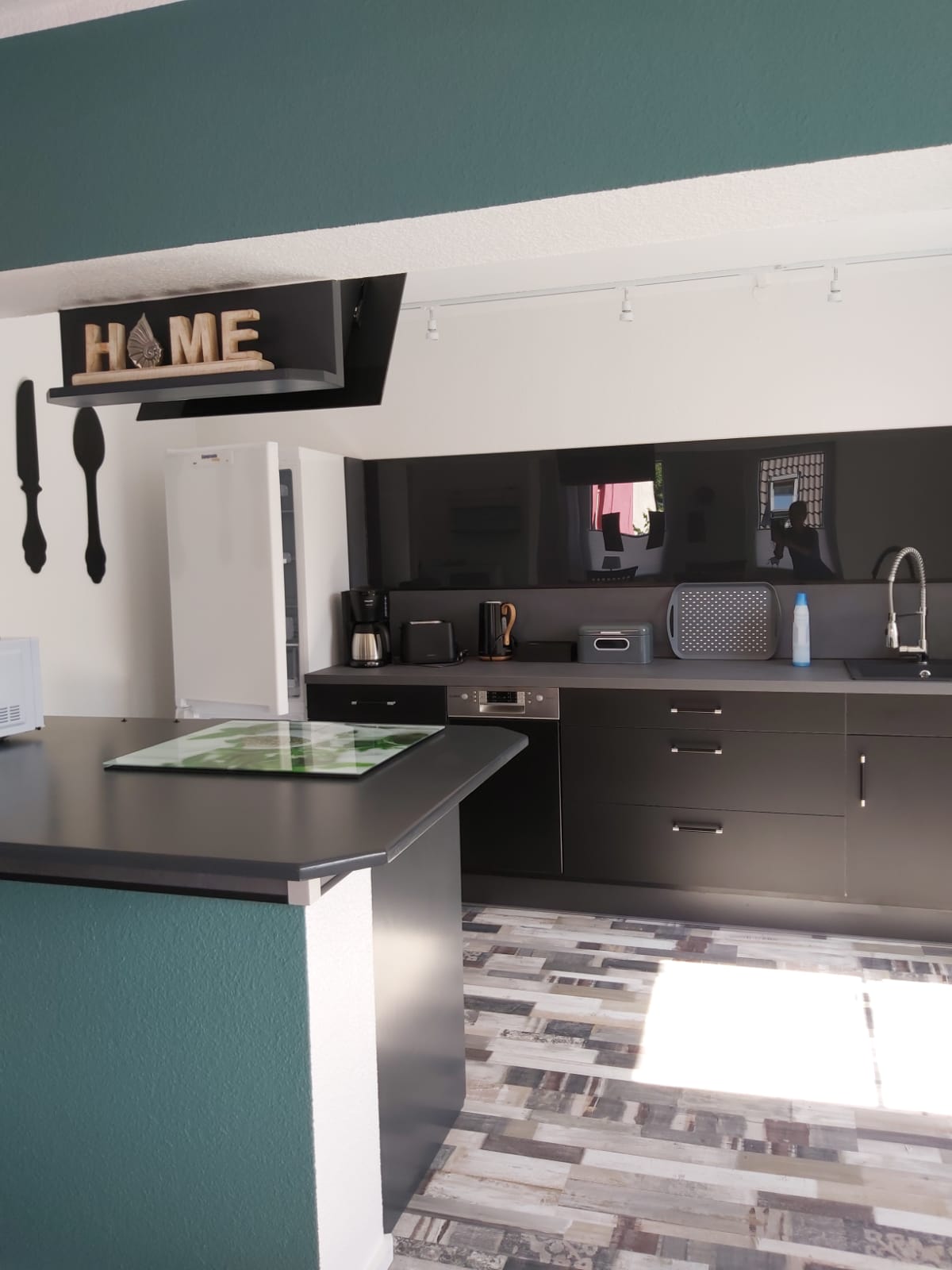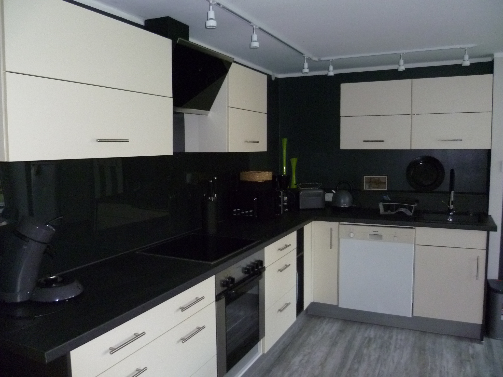 Toaster, Wasserkocher, Kaffeemaschine, Kaffeepadmaschine, Mikrowelle, Cerankochfeld mit Backofen, Küchenutensilien, Kühlschrank, Spülmaschine