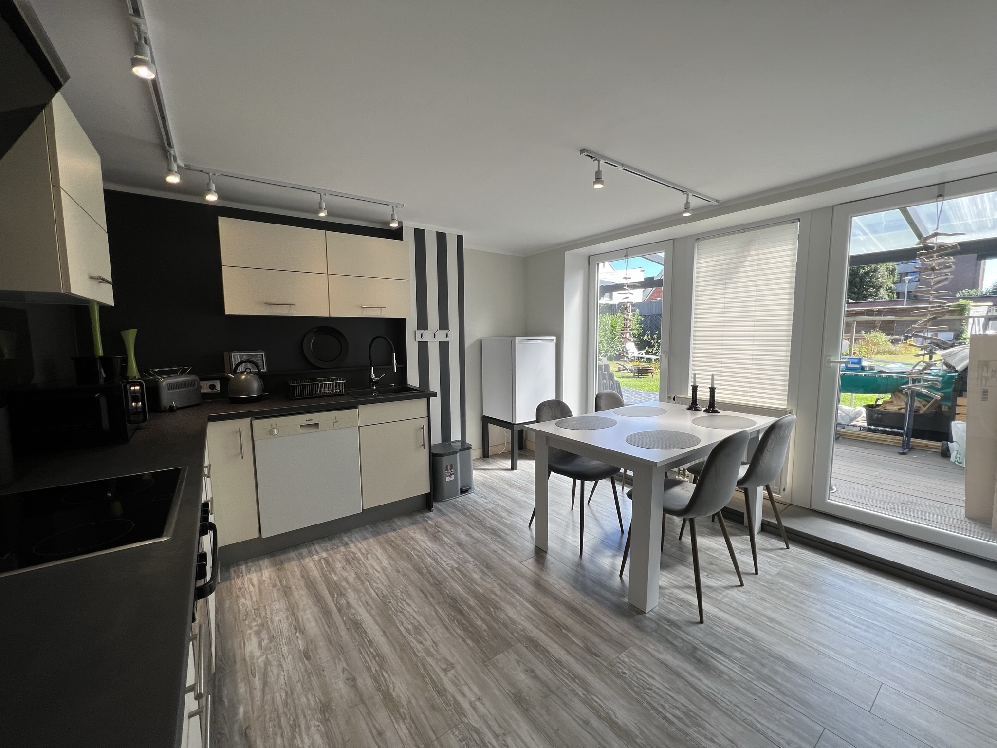 Toaster, Wasserkocher, Kaffeemaschine, Kaffeepadmaschine, Mikrowelle, Herd mit Backofen, Küchenutensilien, Kühlschrank- Gefrierschrank, Spülmaschine, Zugang zur Dachterrasse
