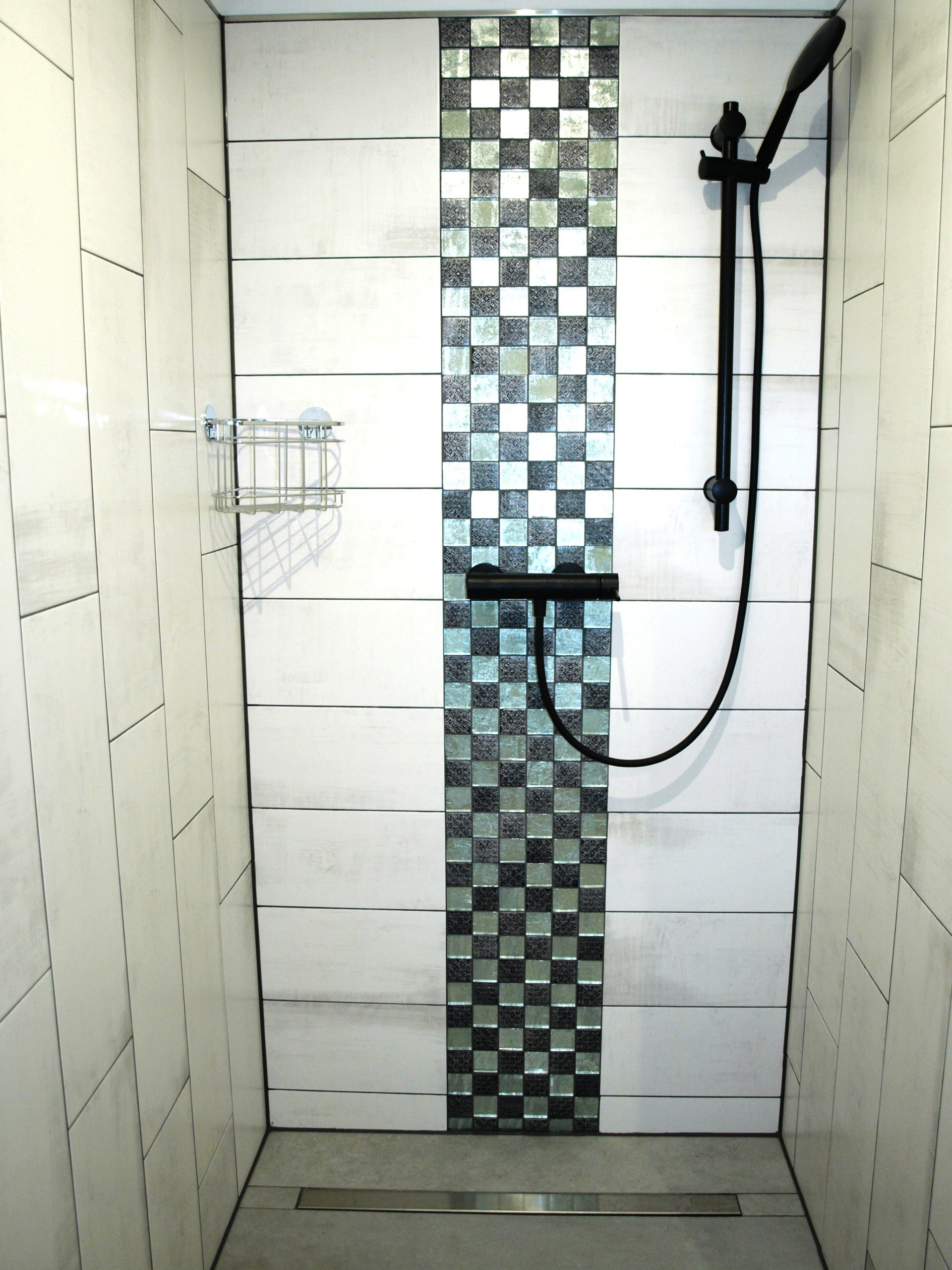 barrierefreie Dusche, WC, Waschbecken, Fließenboden, Wandheizkörper